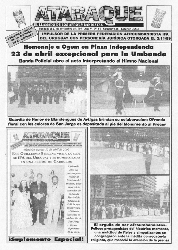 "Convocados por las Instituciones Federadas Afroumbandistas nucleadas en IFÁ del Uruguay, nos hemos reunido hoy 23 de Abril, en una fecha muy especial para la religión Umbanda, pues celebramos a San Jorge y a su similar africano, Orixá Ogum. Nos pareció adecuado y con sumo respeto, ya que Ogum - San Jorge es el guerrero vencedor del bien sobre el mal, conmemorar junto al monumento al artífice de nuestra patria, Don José Gervasio Artigas, prócer nacional, luchador incansable por la libertad y el bienestar de los más débiles.