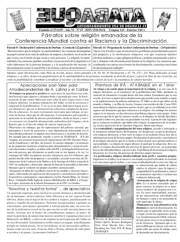 *NOTA: Criticamos la ubicación eventual y condicional que se le dio al tema religioso en el programa del Taller, lo cual hicimos saber durante las reuniones de trabajo en Cancillería, en la sesión inaugural frente a delegados de Naciones Unidas y en el propio subgrupo 3, en ocasión de hacer nuestra propuesta de acciones afirmativas. La Federación IFÁ del Uruguay y el periódico afroamerindio umbandista ATABAQUE, siguiendo la Declaración y el Plan de Acción emanados de la Conferencia Mundial contra el Racismo y la Discriminación, realizada en Durban-Sudáfrica en el año 2000, recordamos a los participantes del Taller, el valor sustancial y proponderante que se le dio a la religión, como arma eficaz en la lucha contra las diversas formas de discriminación, recomendaciones que al parecer fueron desconocidas a la hora de confeccionar el orden de los temas en el programa. Por medio de nuestro reclamo sin embargo, logramos que se creara un capítulo especial que hablara sobre religión de origen afro, en el documento con las conclusiones del Taller para Afrodescendientes.