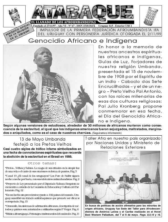 Redactor Responsable del periódico ATABAQUE, Pai Julio Kronberg de Omulú, se propone e invita a conmemorar en tan especial fecha espiritual - surgimiento de la religión Umbanda en 1908 - el sufrimiento atroz de los dos grupos humanos que conforman las bases espirituales de nuestra fe: esclavos negros e indigenas americanos. Templados en la fragua de la humillación y los castigos morales y físicos, ambos pueblos no doblegaron sin embargo sus creencias ancestrales, casi el único patrimonio que fueron capaces de retener, a salvo del ánimo depredador y criminal del blanco europeo dominador.