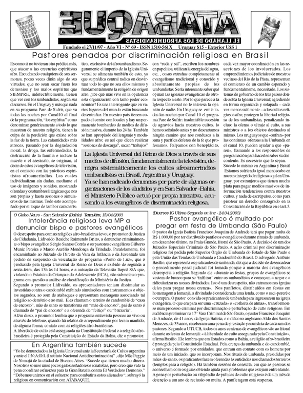 Es como si no tuvieran otra prédica más, que atacar a las creencias espiritistas afro. Escuchando cualquiera de sus sermones, pocas veces dirán algo de sus virtudes, que no sean sacar fuera los demonios y los malos espíritus que SIEMPRE, indefectiblemente, tienen que ver con los umbandistas, según sus discursos. En el Uruguay y más que nada en su programa Pare de Sufrir, que va todas las noches por Canal10 al final de la programación, "los espíritus" como denominan genéricamente a todo lo que muestran de nuestra religión, tienen la culpa de la perdición que existe sobre la faz de la tierra. Las calamidades más atroces, pasando por la degradación moral, la droga, las enfermedades, la destrucción de la familia e incluso la muerte o el asesinato, se originan, al decir de estos evangélicos de televisión, en el contacto con las prácticas espiritistas afroamerindias. Las cuales individualizan sin dudas, mediante el uso de imágenes y sonidos, mostrando ofrendas y costumbres litúrgicas que nos son propias y hasta sesiones o simulacros de las mismas. Todo esto acompañado por el toque de tambor característico, exclusivo del afroumbandismo. Seguramente el imperio de la Iglesia Universal se alimenta también de esto, ya que su prédica central radica en desvirtuar todo lo que no sea ellos mismos y fundamentalmente la religión de origen afro. ¿De qué más vive en la opulencia esta organización con tanto poder económico? Es una interrogante que en varios lugares del mundo están buscando desentrañar. En nuestro país tienen copado el centro con locales y hay un permanente bombardeo de medios de difusión masiva, durante las 24 hs. También se han apropiado del lenguaje y modalidades afro; es así que dicen realizar "sesiones de descarga", sacan "trabajos" con "ruda y sal", escriben los nombres en papelitos, utilizan la energía del agua, etc, , cosas extrañas completamente al evangelismo tradicional y conocido y absolutamente propias de los umbandistas. Sería interesante saber qué opinan las iglesias evangélicas de otrora respecto a esto. Por lo que parece a la Iglesia Universal no le interesa la opinión de nadie. En Uruguay se emite todas las noches por Canal 10 el programa Pare de Sufrir: inadmisible sucesión de agravios hacia nuestros cultos. lo hemos señalado antes y no descartamos ningún camino que nos conduzca a la sana y pacífica defensa de la fe que profesamos. Palpamos con beneplácito, cada vez mayor coordinación en las reacciones de los involucrados. Los emprendimientos judiciales de nuestros vecinos del Río de la Plata, representan el comienzo de un cambio esperado y fundamentalmente, necesitado. Los sistemas de gobierno de los tres países donde actúa la Iglesia Universal; agrediendo en forma organizada y solapada – cada vez menos sutilmente – a los cultos religiosos afro; protegen la libertad religiosa de los umbandistas, penalizando incluso la ofensa o ultraje al culto, a sus ministros o a los objetos destinados al mismo. Los uruguayos que «sufran» por las continuas ofensas a la Umbanda en el canal 10, pueden ayudar a que «paren», llamando a los responsables de programación para hacerles saber su descontento. Es necesario que lo sepan.
