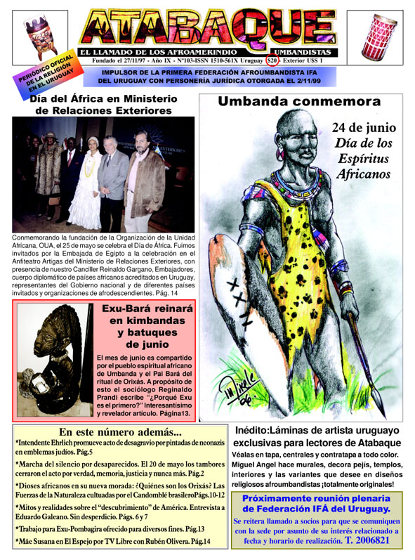 Queridos seguidores de estas páginas, recuerden que está a la venta el DVD del festejo de 8 Años y Trofeo Oxalá. También el 27 de noviembre de este 2006 cumpliremos 9 años de permanencia y batallas ganadas contra la discriminación de nuestra religión. Mucho y muy disfrutado tiempo. Primero fue el Trofeo Oxalá, en el 2007 será el Trofeo Bará.Contáctese con ATABAQUE para organizar la premiación de su Pai o Mãe de Santo y ¡ALUPO! T.2006821
