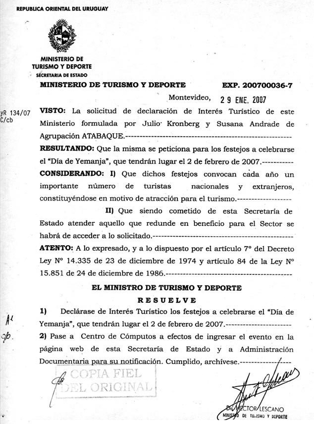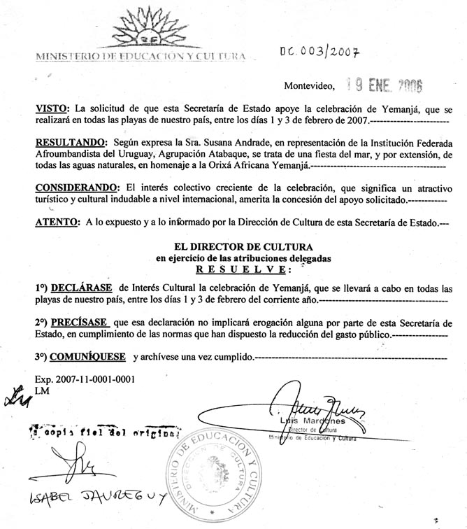 Copias originales de las Resoluciones de los distintos organismos de gobierno sobre Día de Yemanjá