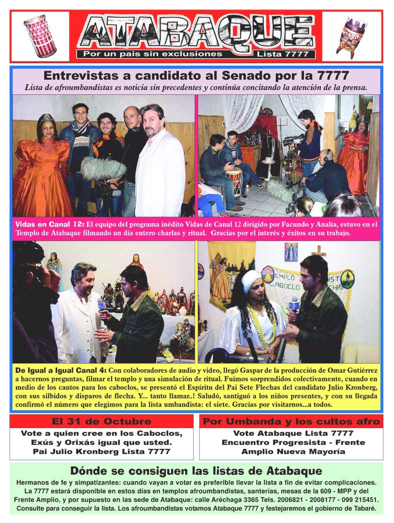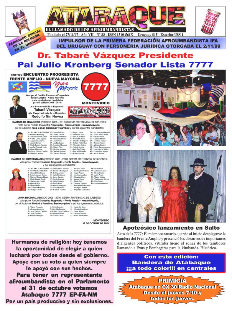 Estos profesionales de la música y la percusión religiosa afroumbandista, integran junto a muchos otros, la lista 7777 de Atabaque dentro del Frente Amplio. Baluartes de una cultura africana que no se puede perder, son todos pais y maes de Umbanda y de Santo, sacerdotes y sacerdotisas que han querido tomar el desafío de un cambio de país, de no más penurias del pueblo y hacer algo por esto desde la política. ¿Porqué votarlos? Debemos apoyarnos porque inevitablemente -más allá o más acá de simpatías o desavenencias- los beneficios serán para todos. Porque si al gobierno suben, como lo piensan hacer, los de la Iglesia Universal, no es muy difícil pensar lo que harán si ahora (sin estar dentro) hacen lo que hacen. Por eso es imprescindible tener un representante afroumbandista en el Parlamento. Uno o muchos. Cuantos más votos, más chances tendrán los integrantes de la lista.