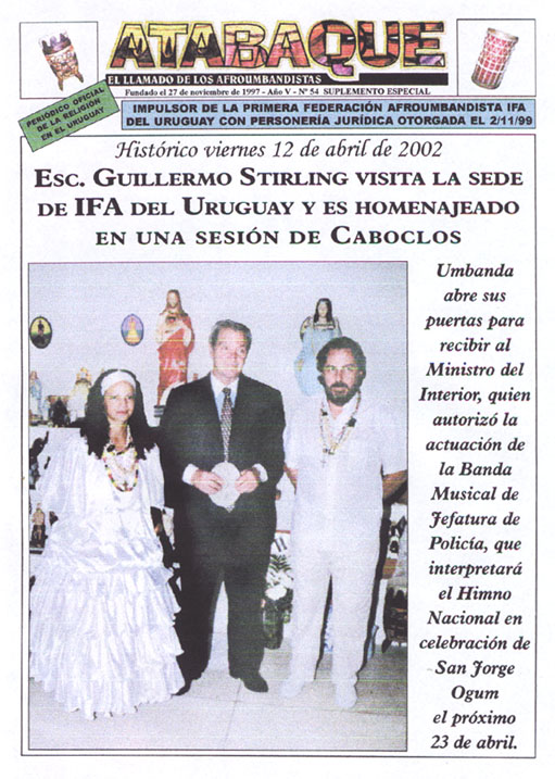 El contar con la presencia de personas destacadas socialmente, además de prestigiar nuestras ceremonias, legitima nuestro accionar como religión. En el caso del Sr. Ministro Guillermo Stirling, teníamos tres grandes motivos para agradecerle: 1)La destrucción de los expedientes de templos de nuestra religión que existían en Jefatura de Policía desde hace casi treinta años, además de dejar sin efecto el registro voluntario, al que todos los religiosos de la comunidad umbandista y africanista, estábamos acostumbrados a someternos. 2) El otorgamiento de los servicios de vigilancia 222 para los templos pertenecientes a la Institución Federada IFÁ del Uruguay. 3) La autorización otorgada a la Banda Policial para que actúe el 23 de abril próximo, en el acto en Plaza Independencia en homenaje a Ogum, organizado por nuestra Federación. Sobrados y trascendentes motivos nos llevaban a solicitar su presencia en nuestros eventos. Le habíamos invitado a celebraciones de aniversario del periódico y no le había sido posible concurrir. En esta oportunidad, mediante la amable gestión de los señores Santiago Tricánico y Roberto Losano, la visita se concretó. El propio Ministro dijo "el viernes 12 de abril tengo tiempo y les debo una visita a esta gente" y allá salimos a organizar, corriendo pero con muchas ganas, un ritual festivo para recibirle con los templos que se enteraron o pudimos ponernos en contacto, dado que nos dieron sólo dos días para planear todo.