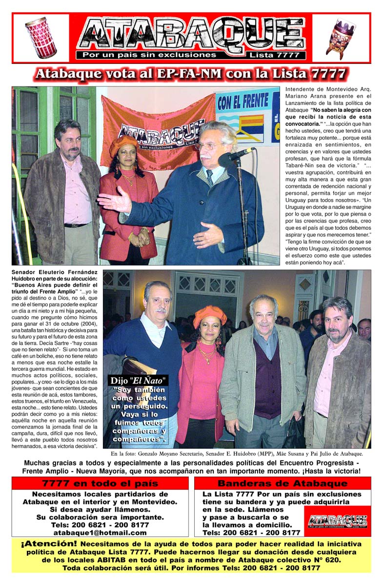 En fecha 10 de mayo de 2004, la Dirección Nacional del Encuentro Progresista - Frente Amplio/ Nueva Mayoría, admitió por unanimidad el ingreso al Partido de la Agrupación política ATABAQUE de extracción religiosa afroumbandista, surgida a través de simpatizantes y seguidores del periódico del mismo nombre, fundado en 1997. El movimiento, reconocido por la Corte Electoral, obtuvo números de lista propios que servirán de emblema en las próximas elecciones de autoridades nacionales.