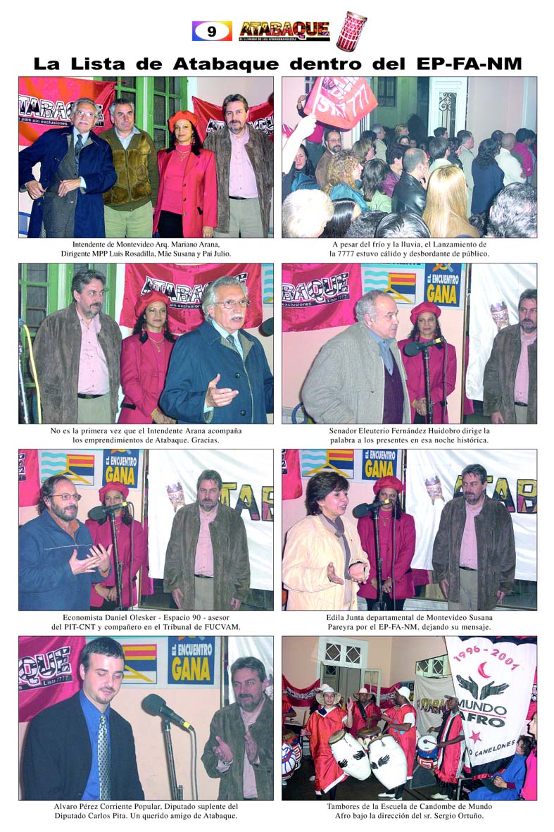 Destacamos las presencias de: Intendente de la ciudad de Montevideo Arq. M.Arana, Candidato y próximo Vicepresidente del Uruguay Senador Rodolfo Nin Novoa, Senador Líder del Movimiento de Participación Popular Eleuterio Fernández Huidobro, Presidente de la Junta Electoral –Espacio 90- compañero Walter Pesqueira, Los Dirigentes del Sector MPP-Espacio 609 Luis Rosadilla y Eduardo Bonomi, La Edila de la Junta Departamental Susana Pereyra, Alvaro Pérez Secretario Político del Diputado Carlos Pita-Corriente Popular-, Alvaro Martínez del Centro UNESCO Montevideo, integrante de la Vertiente Artiguista, Economista Daniel Olesker integrante del Espacio 90 y Asesor del PIT-CNT, Erika Toyos ideadora del Proyecto de Ley pro Comisión Antirracismo y Antidiscriminación, Representantes de Organizaciones Mundo Afro.