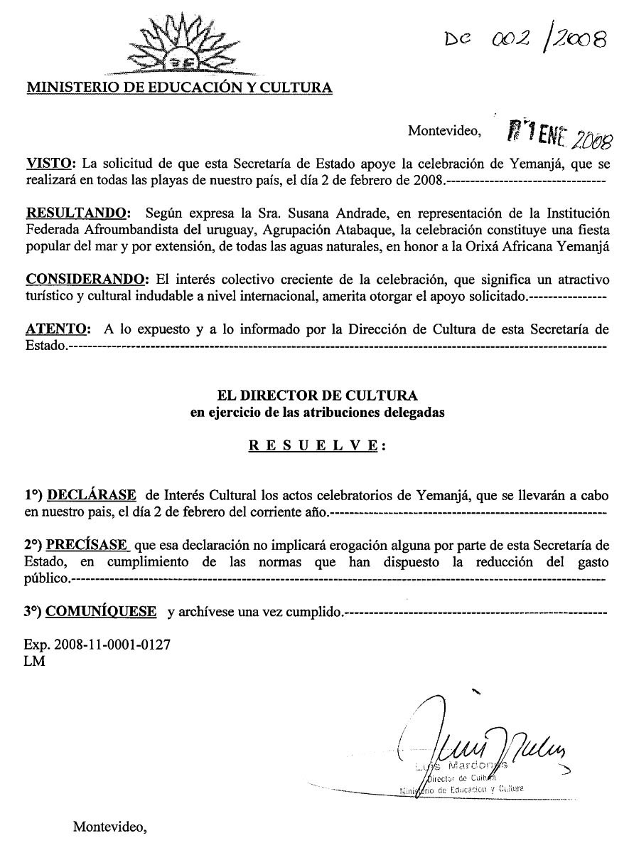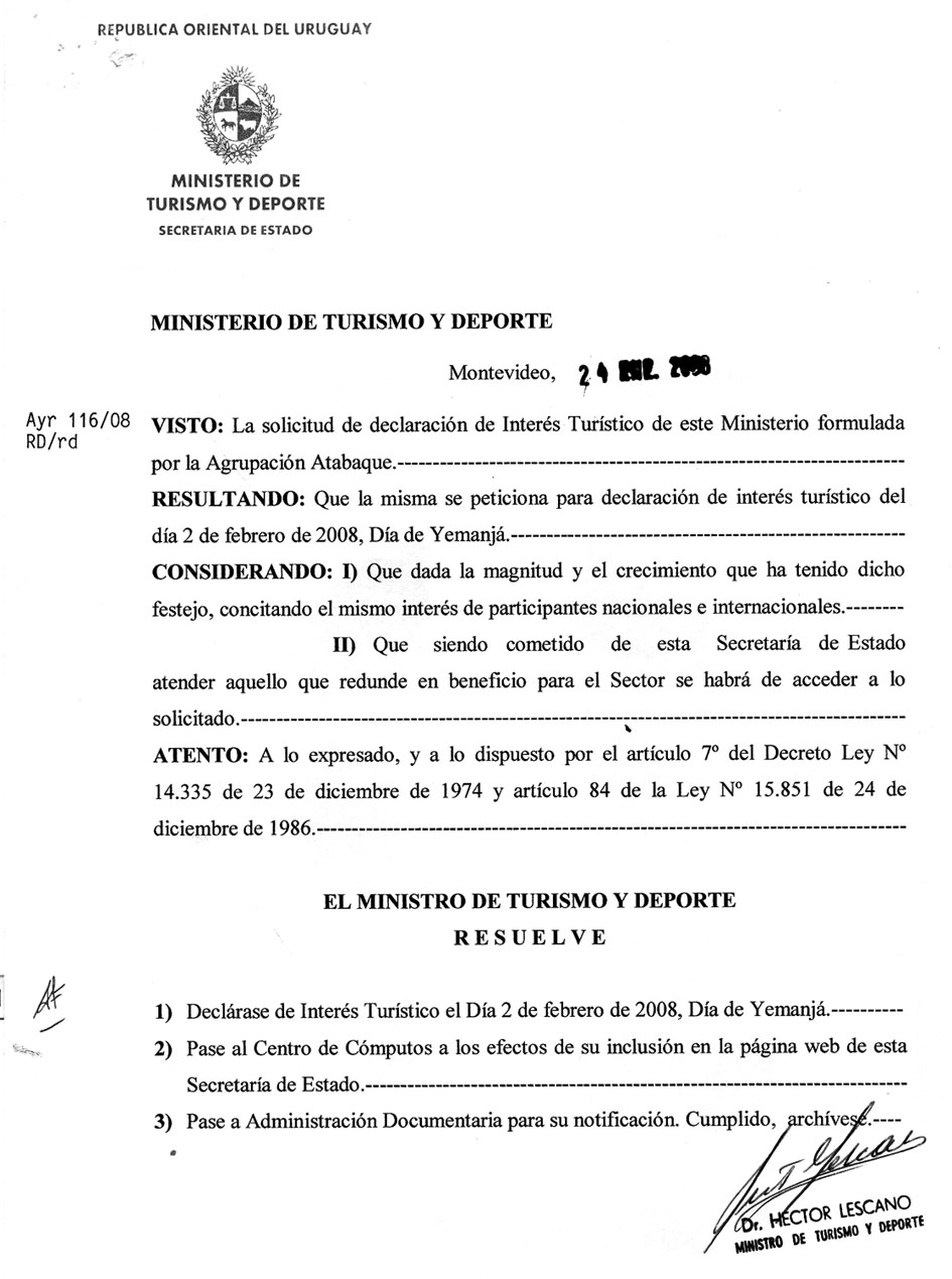 RESULTANDO: 1o.) que en dicha nota se manifiesta que este festejo de origen afroumbandista ha devenido en celebración popular, convocando masiva cantidad de público que mantiene y acrecienta año a año, concitando el interés de espectadores y participantes locales e internacionales expresamente llegados para ver y registrar el multitudinario evento, siendo la fiesta del mar objeto de filmes, notas de prensa destacadas, obras musicales, literarias y diversas expresiones culturales, habiendo adquirido carácter de festejo tradicional uruguayo dentro del calendario nacional;